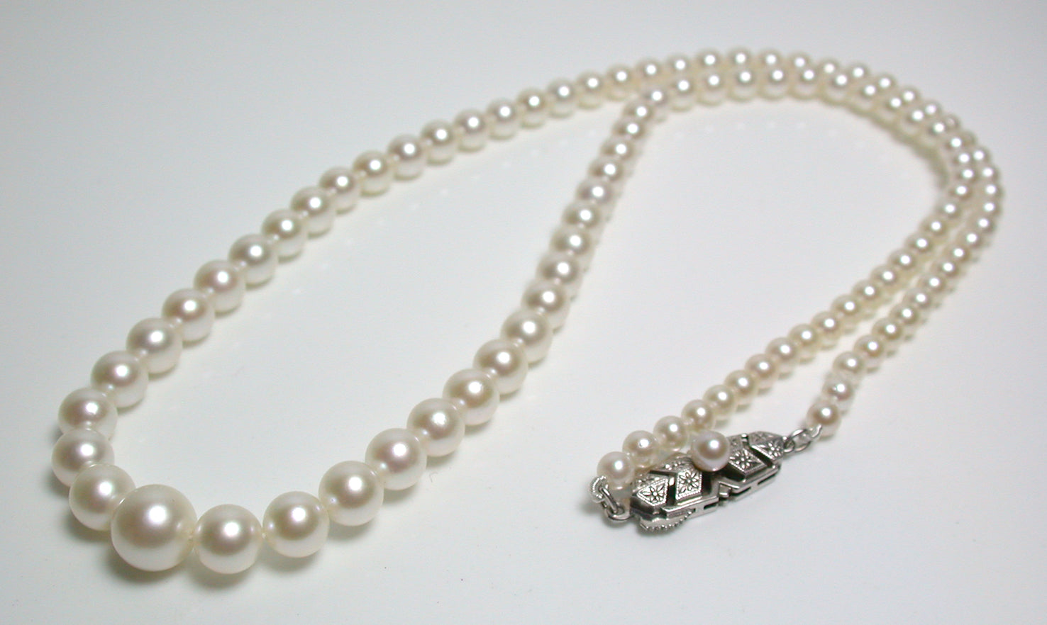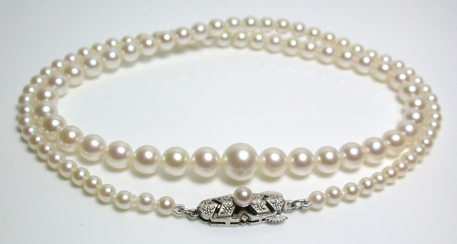 The pearls have been cleaned and newly restrung onto double threaded white silk, with knots placed between only the end pearls as it would have been originally. If you would prefer the necklace to be strung with knots between each pearl, I can do this free of charge, it will however lengthen the necklace by approximately 1-1.5 inch.