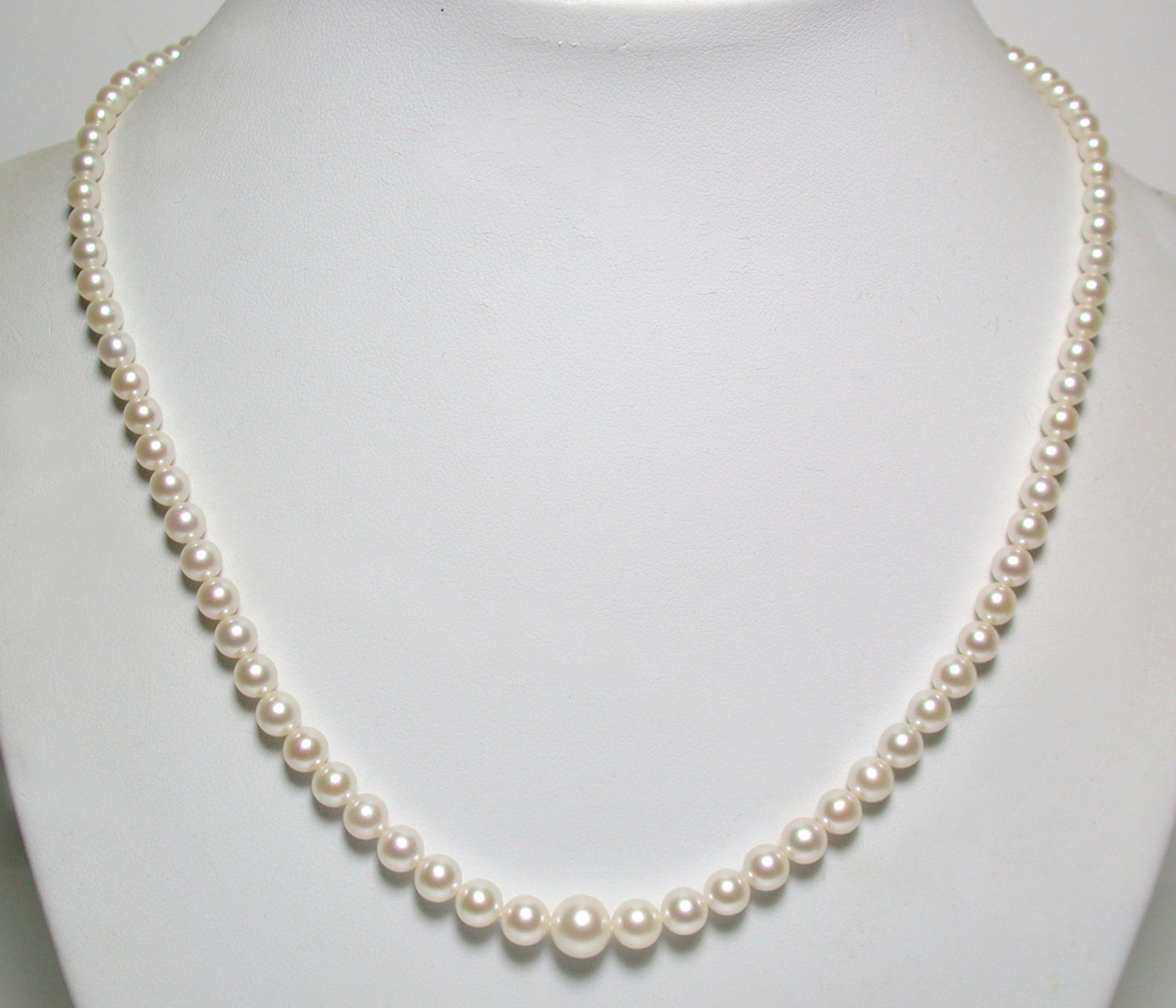 An original 1960's Mikimoto cultured Akoya pearl necklace. This beautiful 46.5cm (18.25 inch) necklace is made from 3.3-7.4mm perfectly round white Akoya pearls with a thick nacre, glowing luster and cream overtones. The necklace has its original clasp; a silver engraved pearl clasp set with a single pearl (the clasp has the Mikimoto makers mark of a M in a clam shell).